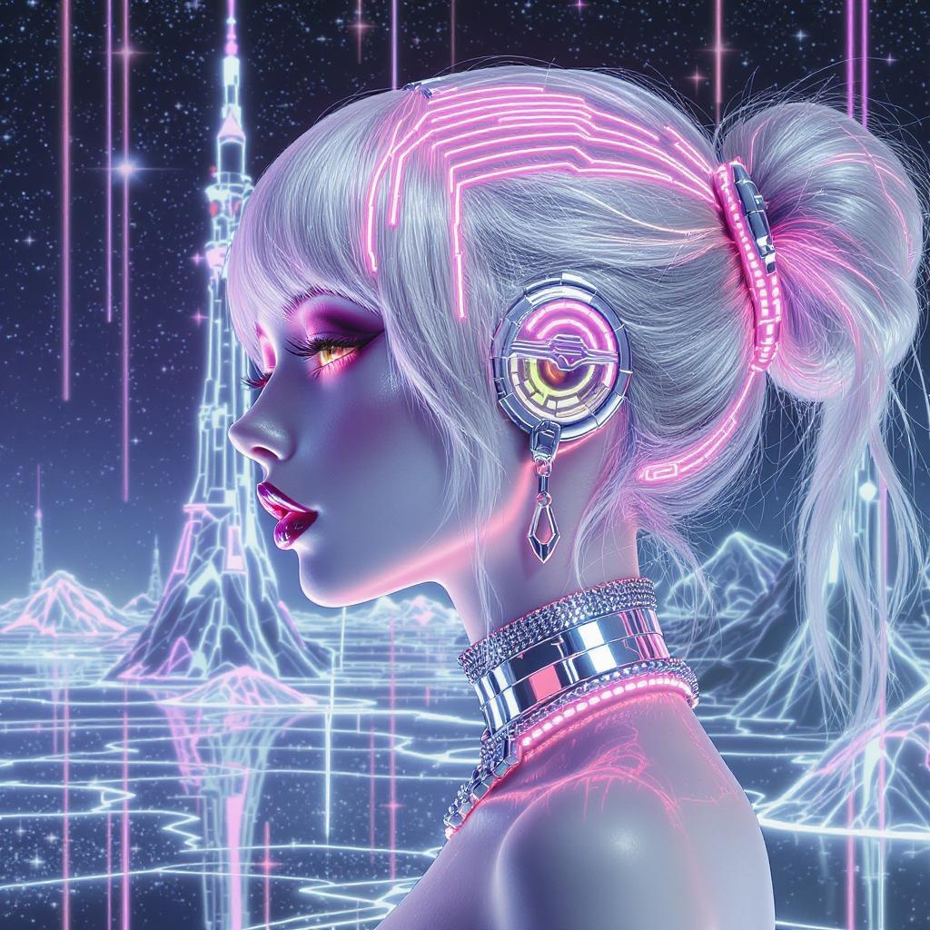 A futuristic and vibrant cyberpunk-themed graphic design featuring a girl's side profile. Her pretty and cute face exudes a sense of intrigue, highlighted by gleaming lips and a soft pink electronic glow. Her white skin contrasts elegantly with a sleek silver shiny necklace that complements her overall aesthetic. The backdrop is a seamless silver landscape, echoing a metallic world. This immersive scene combines elements of modernity and allure, drawing you into its captivating charm.