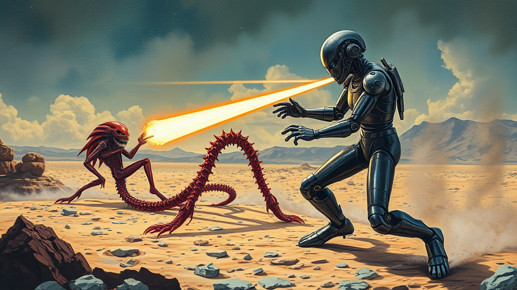 A futuristic android, crafted with sleek metallic armor, fires intense laser beams from its glowing eyes at a cosmic alien creature being dragged across a barren, rocky landscape by its elongated, tentacle-like legs. The scene is bathed in a surreal, otherworldly light, capturing the high-stakes tension of an epic science fiction battle. This dynamic illustration is vividly rendered in a style reminiscent of Robert McGinnis and Frank Frazetta, showcasing intricate details and dramatic contrasts.