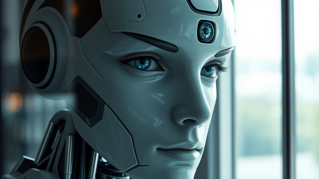 A futuristic android gazes out from behind a window, capturing a close-up of its human-like features; the design blends the elegance of a sophisticated humanoid with the intricacies of cutting-edge artificial intelligence. The detailed portrait highlights the arrival of advanced AI, as the robot's expression suggests a coming singularity in technology. With a focus on the realism of its eyes and the complexity of its synthetic skin, this humanoid represents the next evolution in android engineering, poised on the brink of profound awareness.