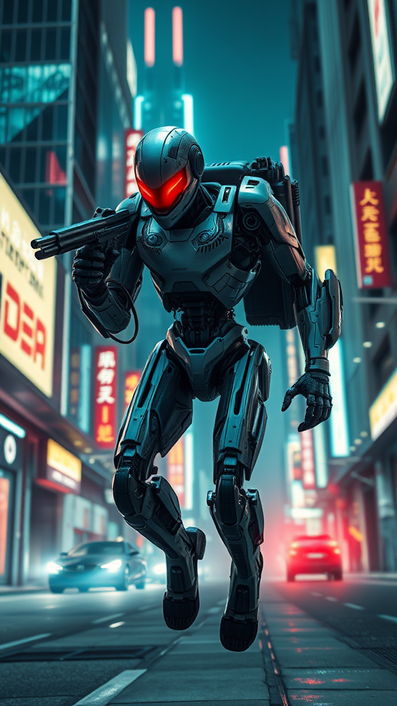 A futuristic android hitman, with sleek metallic limbs and glowing red optics, navigates through the neon-lit cityscape, tracking its target with precision and efficiency. The whirring of servos and the faint hum of integrated systems blend with the ambient noise of the urban jungle as it closes in for the kill. Its AI-driven mind assesses countless variables in real time, ensuring the mission's success while adapting to unexpected obstacles. As it approaches, the cybernetic assassin's advanced camouflage activates, cloaking it in shadow, leaving only whispers of its presence in the alleyways of the city.