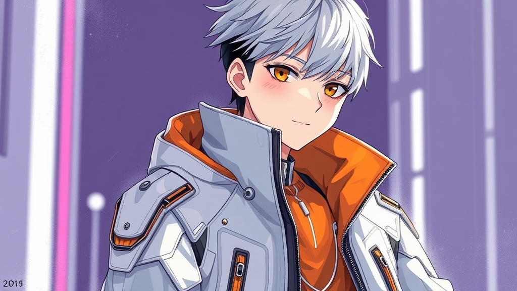 A futuristic anime character wearing a sleek white and orange jacket, depicted in a cyberpunk setting with a color palette of dark white and soft violet tones, showcasing meticulous brushwork and a sense of automatism, reminiscent of official art style. The artwork presents a clear and intricate development of the character, with high attention to detail and imaginative embellishments, maintaining a balance between innovation and the original concept.