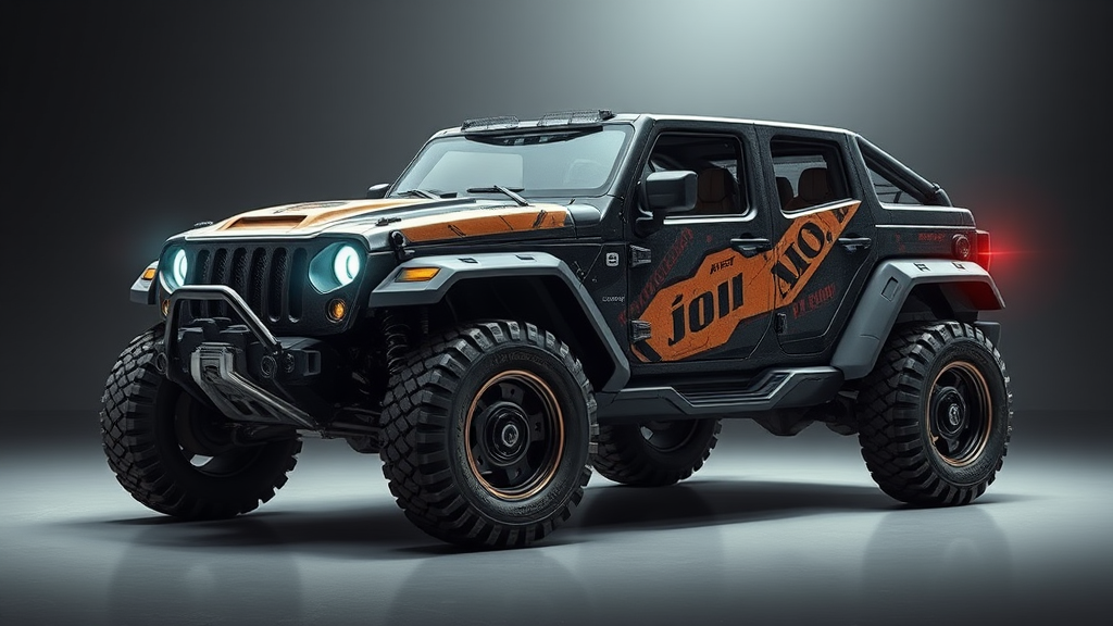 A futuristic armored sci-fi Jeep blending the ruggedness of Halo's iconic Warthog and the sleek innovation of alternate car concepts, featuring intricate design elements inspired by Sid Mead's visionary style and Alex Ross's dynamic aesthetic. The vehicle showcases highly detailed concept art with matte painting techniques, emphasizing intricate mechanical and aesthetic details. Following the rule of thirds, the design employs dynamic and cinematic lighting to highlight the vehicle's form, resulting in a clean, denoised, and centered render. The Jeep is a marvel of futuristic technology, capable of traversing various terrains with ease and style, while exuding an aura of strength and sophistication.