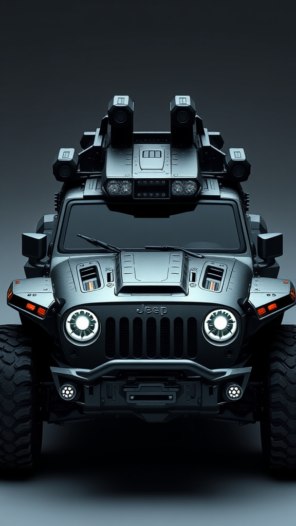 A futuristic armored sci-fi Jeep inspired by the aesthetics of Halo and alternate car designs, incorporating the visionary styles of Sid Mead and Alex Ross. The vehicle features intricate details and advanced concept art elements with an emphasis on cinematic appeal and dynamic lighting. The design focuses on the rule of thirds and boasts a clean, centered render with a matte finish, enhancing its sleek yet rugged appearance. The composition presents a blend of detailed, denoised textures and bold architectural lines, showcasing a highly detailed and polished exterior. The Jeep stands ready for exploration, embodying adventure and innovation at its core.