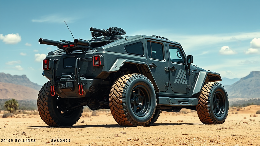 A futuristic armored sci-fi Jeep inspired by the style of Halo and Sid Mead, blending the rugged, tactical design elements with sleek, aerodynamic lines. This concept car showcases intricate details with seamless integration of defense technology, featuring robust, reinforced panels and cutting-edge weaponry systems. The vehicle is set against a post-apocalyptic landscape in a matte painting style, emphasizing dynamic lighting and a cinematic atmosphere. The image adheres to the rule of thirds, offering a balanced composition, with a centered and meticulously detailed render, achieving a denoised and clean finish, highlighting the seamless fusion of art and engineering.