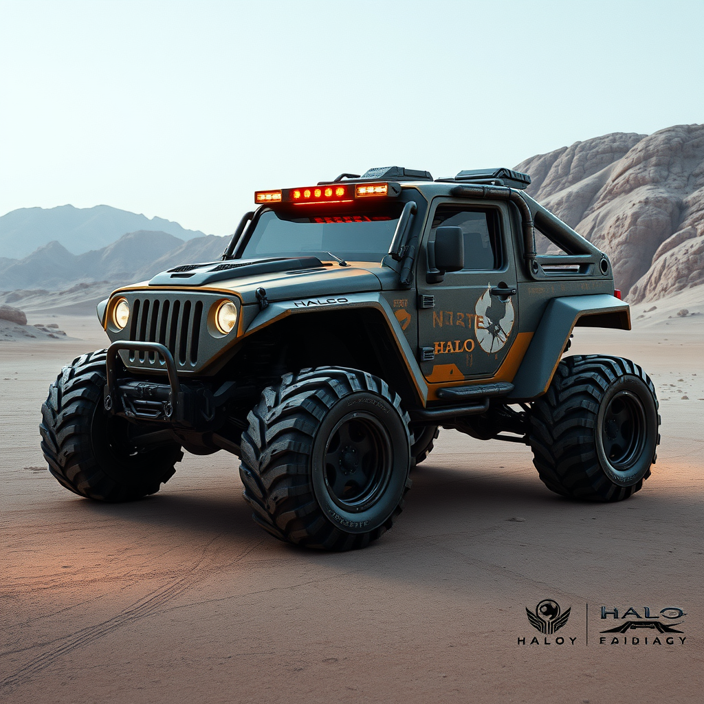 A futuristic armored sci-fi Jeep inspired by the style of Halo, featuring an alternate design reminiscent of high-concept vehicles, blending the innovative vision of Sid Mead with the dramatic flair of Alex Ross. The vehicle showcases intricate details, embodying both concept art finesse and matte painting techniques, highlighted by dynamic and cinematic lighting. The design is meticulously detailed, utilizing the rule of thirds for balanced composition, and presented as a clean, denoised render, centered on the canvas. Subtle creative elements have been integrated to enhance the core concept while maintaining its essence.