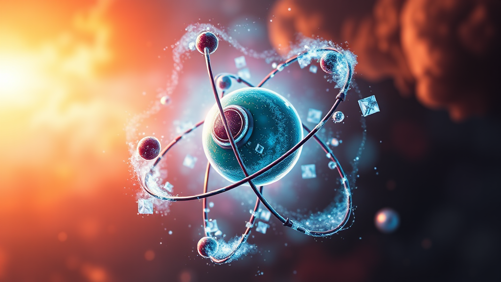 A futuristic atom with a nucleus of protons and neutrons enveloped by an ethereal cloud of electrons, captured with dramatic lighting and vibrant, cinematic colors. The composition is both professional and artistically refined, showcasing a breathtaking level of detail and massive scale. The scene feels almost romantic, inspiring deep thoughts with its surreal beauty and impeccable symmetry. Rich, deep colors and clear, perfect light lend an open, novel quality to the piece. Sharp focus highlights the elaborate textures and intricate structures, creating a creative and epic portrayal that is extremely refined and visually stunning.