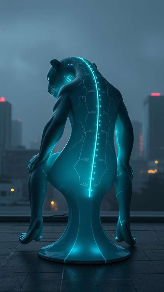 A futuristic biomimetic chair, melding technology with nature in a dystopian setting, takes the form of a sleek and sinewy design inspired by the fluid elegance of a panther. Its structure mimics the animal's muscular contours with responsive materials that adapt to the user's shape, featuring a semi-translucent skin that glows subtly with embedded circuitry veins. The chair's base is reminiscent of a panther's poised paws, gripping the ground with an organic yet mechanical aesthetic, while its backrest curves like a spine, merging seamlessly into an urban landscape shrouded in a persistent twilight haze.