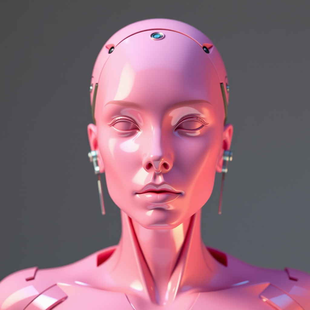 A futuristic bionic sculpture of a woman featuring a smooth, glossy pink ceramic face, prominently emerging from the background. The piece is viewed from the front and brightly illuminated, showcasing ultra-realistic detail in modern minimalist style with a slight metallic sheen to enhance its futuristic appeal, emphasized by a 3:4 aspect ratio.