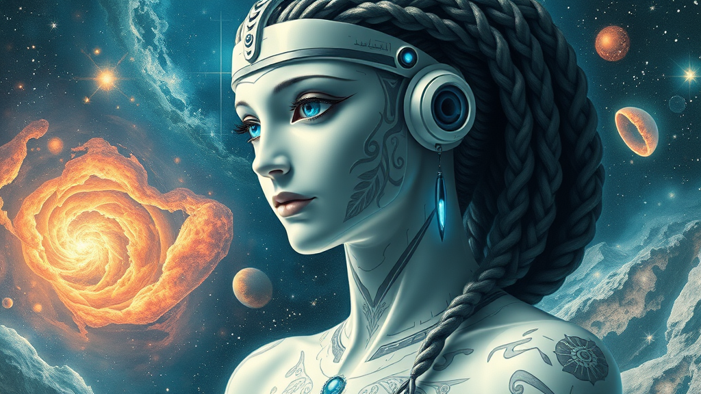 A futuristic Birth of Venus painting featuring a pure white shiny translucent-skinned Egyptian Arab android, adorned with intricate tribal QR code digital tattoos and sleek cyberware enhancements, set against a cosmic sea of stars and vibrant nebulae in a Botticelli-inspired style. The android has captivating blue crystal eyes and a humanoid form, accentuated by elegant braided hair. The scene captures an ethereal blend of classic art and advanced technology with a dreamy, stylized allure.