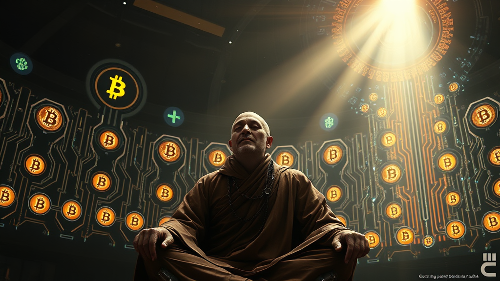 A futuristic bitcoin monk clad in cybernetic robes, immersed in deep meditation, surrounded by holographic symbols of bitcoin in a high-tech spiritual sanctuary; the atmosphere is somber and deeply reverent with elements of cyberpunk and sci-fi, glistening circuit-like patterns adorning the walls. God's ray of light pierces through the ceiling, casting a divine glow over the monk, his eyes reflecting a mix of devotion and technology. The scene is captured in photorealistic detail, merging ancient spirituality with cutting-edge innovation, where faith meets futurism in a transcendent moment.