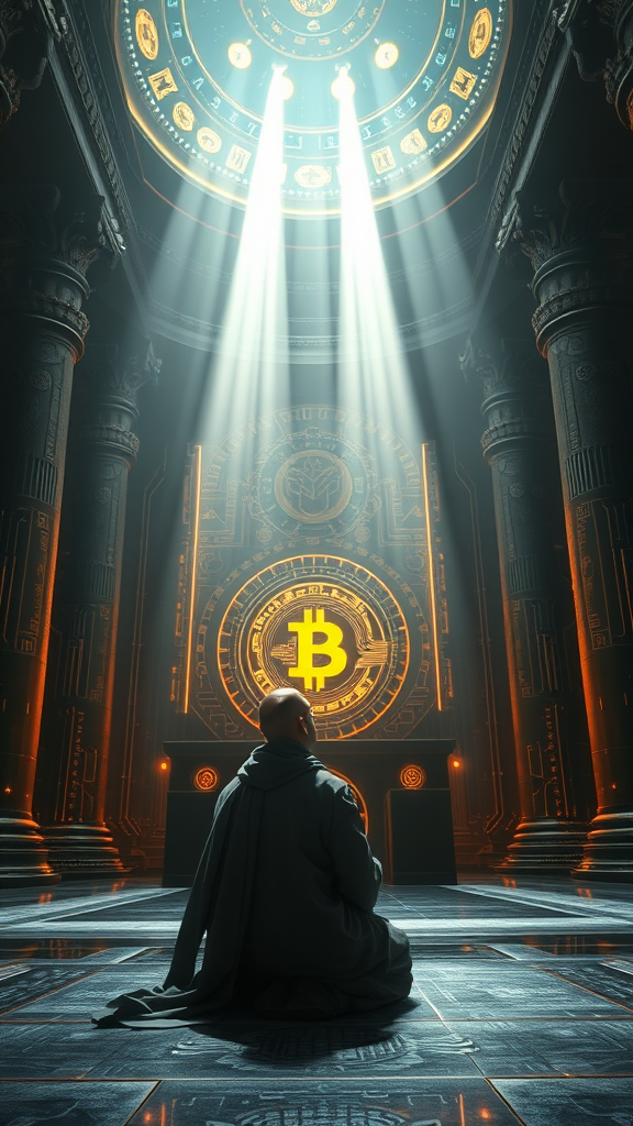 A futuristic bitcoin monk kneels in reverence before a digital altar adorned with glowing cryptocurrency symbols, surrounded by a high-tech temple that fuses ancient architecture with advanced technology. The atmosphere blends cyberpunk and sci-fi elements, casting a somber yet awe-inspiring aura. Beams of divine light pierce through the temple’s ceiling, illuminating the monk's serene face, eyes closed in meditation. The intricate circuitry patterns on the walls reflect the light, creating a halo effect around the monk. The setting is imbued with a sense of deeply spiritual transcendence, where technology and mysticism converge in photorealistic detail.