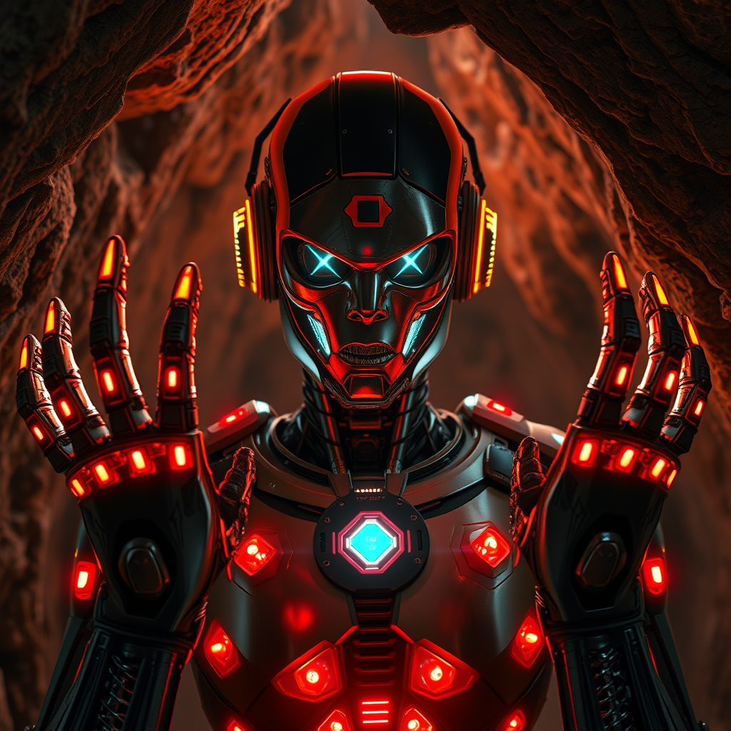 A futuristic borg with a c4ttitude nestled in a mountain cave, exuding a distinctly sci-fi Star Trek vibe. The setting features moody lighting that casts dramatic shadows against the cave walls, while the metallic surfaces of the borg gleam with a glow effect. Intricate LED displays pulse with life, enhancing the cinematic environment with vibrant hues. The borg's features include a cloned face with cross eyes and several mutated hands adorned with extra fingers, adding an unnerving yet fascinating anomaly to its appearance. Set in an extreme detail, best quality UHD and HDR composition, the scene captures every intricate element in 16k resolution, emphasizing the sophisticated aura and futuristic world.