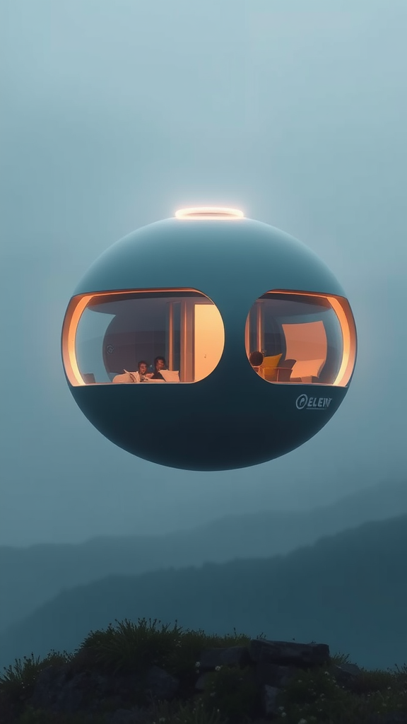 A futuristic capsule house hovers gracefully above the landscape, gently suspended in mid-air, surrounded by a soft luminescent glow.