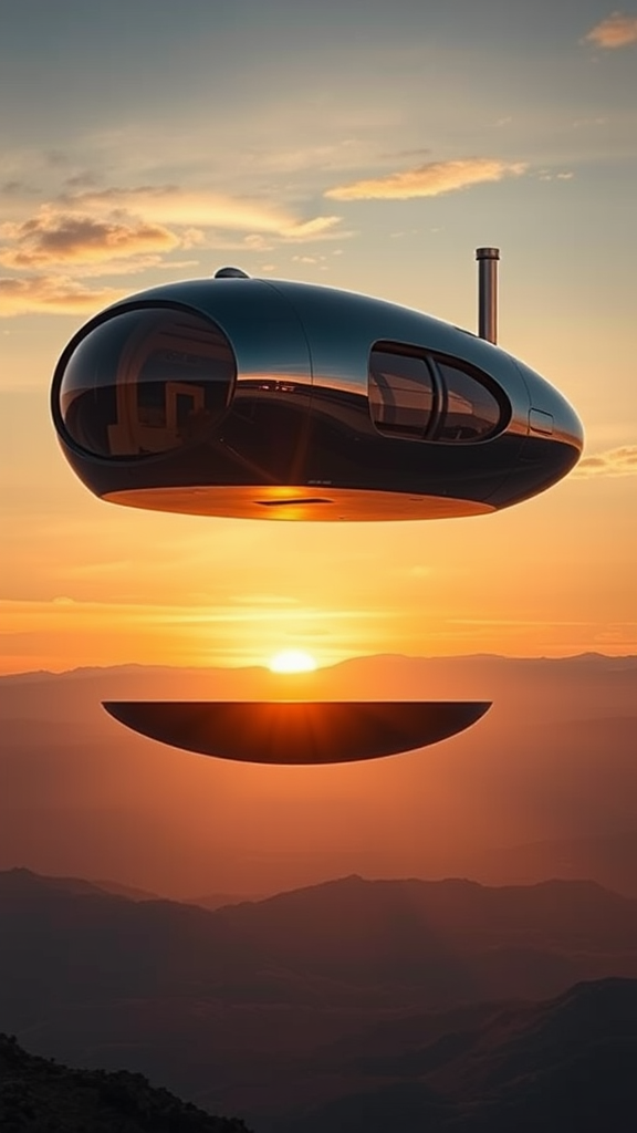 A futuristic capsule house hovers serenely above the ground, suspended effortlessly by advanced anti-gravity technology, its sleek metallic exterior reflecting the golden hues of the setting sun, with panoramic windows offering breathtaking views of the landscape below.