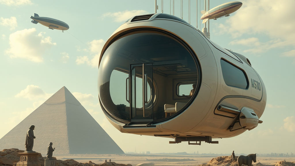 A futuristic capsule house suspended in mid-air, adorned with an epic front door and expansive glass windows. This highly detailed, cinematic scene evokes a sense of realism with an artistic touch inspired by Fenghua Zhong. The setting is slightly blurred and surreal, featuring distorted forms with extra appendages and unconventional shapes. In the background, an Egyptian pyramid looms, accompanied by statues. The sky is dotted with two balloons and a drifting blimp, adding to the intriguing and unusual atmosphere.