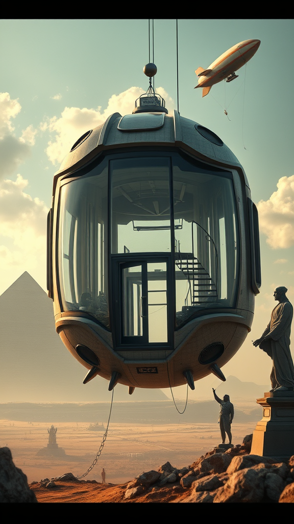 A futuristic capsule house suspended in mid-air, featuring an epic front door and expansive glass windows, intricately detailed and cinematic with a touch of realism, inspired by Fenghua Zhong's style. The scene is artistically rendered with a slightly blurry and surreal atmosphere. Elements include distorted shadows, an Egyptian pyramid in the background, and a statue adding an ancient touch. In the sky, two balloons and a blimp float nearby. The composition hints at extra appendages and unusual forms, adding a sense of mystery and mutation.