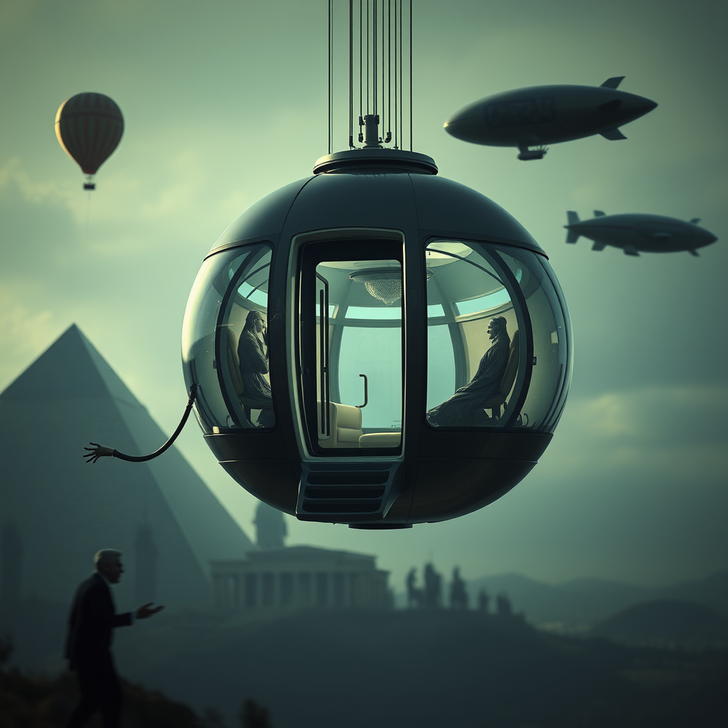 A futuristic capsule house suspended in mid-air, featuring an epic front door and large glass windows. The scene is cinematic and highly detailed, with a realistic touch, inspired by the style of Fenghua Zhong. The background is slightly blurry, with hints of fuzzy elements. Occasional visual oddities include disfigured and mutated forms, such as extra arms and fingers. The environment is shadowy, with the silhouette of an Egyptian pyramid and statues in the distance. Floating nearby are two large balloons and a sleek blimp, adding to the surreal atmosphere.