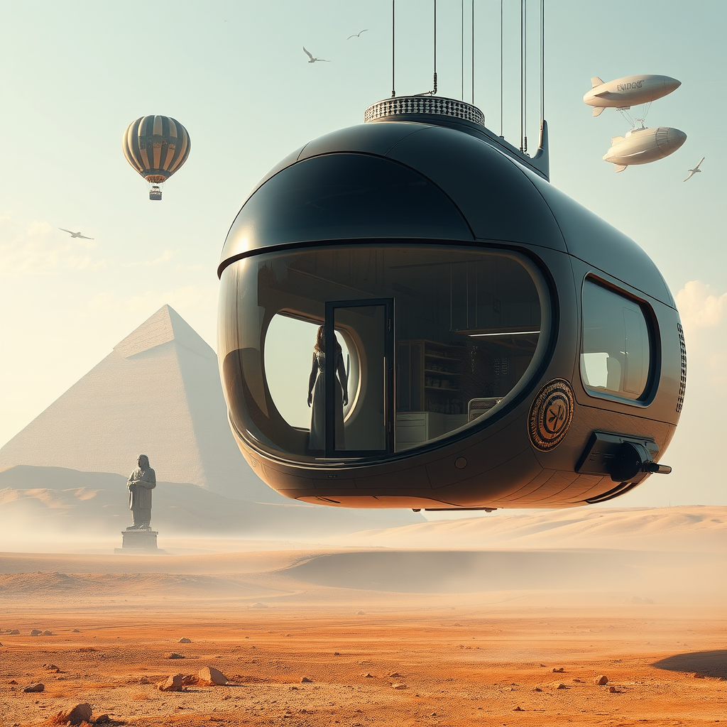 A futuristic capsule house suspended in the air above the ground, featuring an epic front door and large glass windows. The scene is rendered in high detail with cinematic, realistic artistry, inspired by fenghua zhong. The environment around the house blurs softly, creating a dreamlike atmosphere. In the distance, an Egyptian pyramid stands as a monumental backdrop, accompanied by a mysterious statue casting long shadows. A floating balloon and a blimp glide through the sky, adding a touch of whimsy to the setting. Despite the surreal elements, the design remains focused on the captivating structure and its artistic presentation.