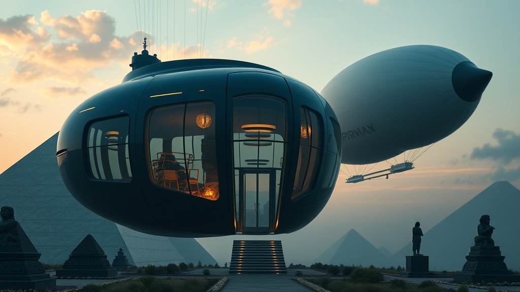 A futuristic capsule house suspended in the air, featuring an epic front door and expansive glass windows, designed with high detail and cinematic realism in mind. The structure evokes a sense of grandeur reminiscent of Fenghua Zhong's artistry. Surrounding the house are elements of mystery, like shadowy Egyptian pyramids and statues, all set against a surreal backdrop. In the sky, a gigantic balloon blimp drifts by, enhancing the dreamlike atmosphere with whimsical touches of blurred lines and abstract forms, creating an otherworldly and captivating scene.