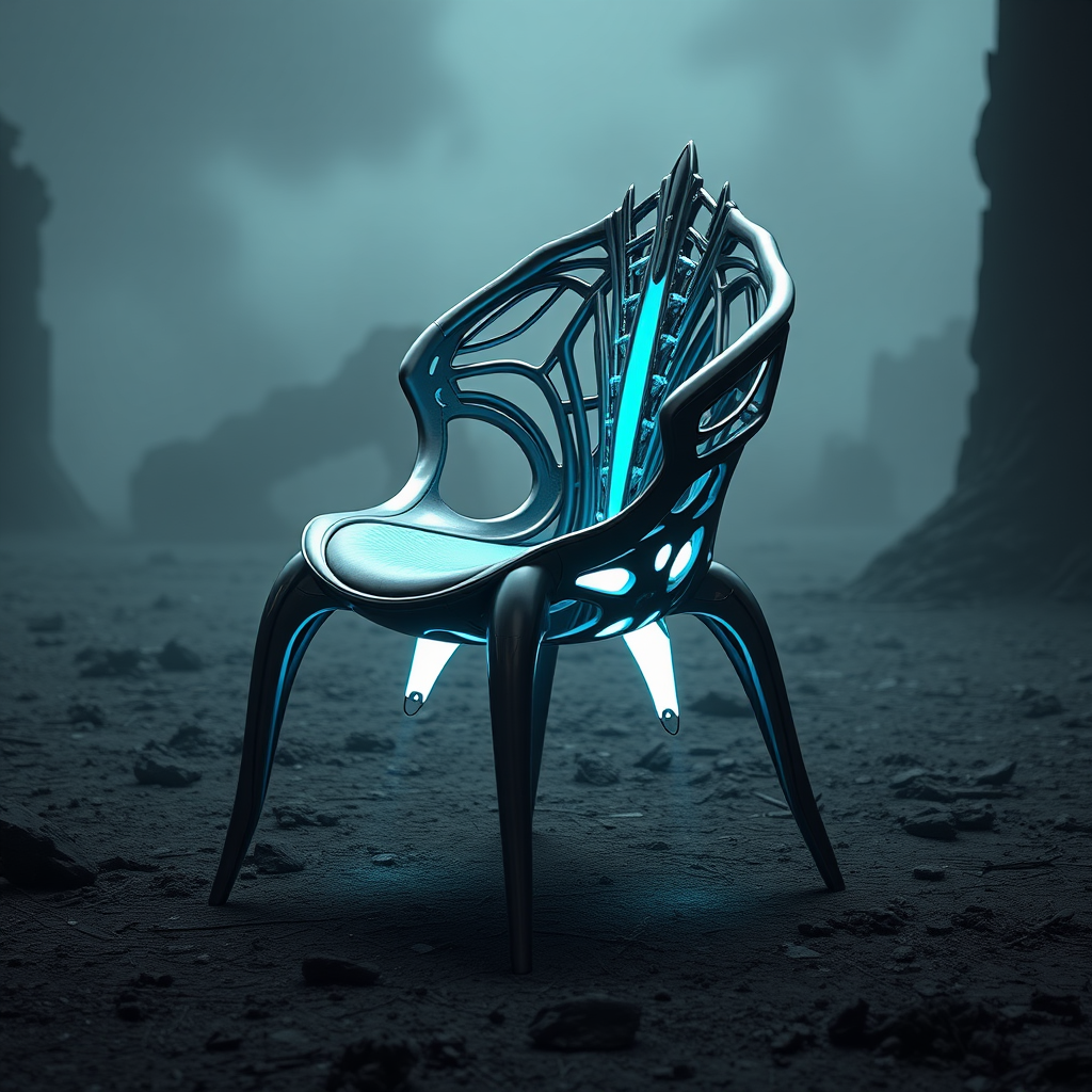 A futuristic chair design showcasing the seamless merger of technology and nature, inspired by the sleek forms of predatory animals. Its structure mimics the agile grace of a panther, with elongated, sinewy legs that blend into a spine-like backrest, creating an ergonomic cocoon. The seat is crafted from a bioluminescent material that pulses gently, echoing the subtle glow of deep-sea creatures. Set against a dystopian backdrop, the chair’s metallic and organic elements are in stark contrast to the ashen, oppressive environment, symbolizing resilience and adaptability amid decay.