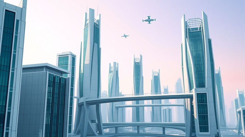 A futuristic cityscape featuring towering skyscrapers with geometric designs, connected by sleek sky bridges. Clean lines outline the buildings, with large, transparent windows reflecting light. Simple shapes create an organized urban structure, with flying vehicles zipping through the air. A limited color palette of silver, teal, and white emphasizes the modern, high-tech ambiance. The sky is a gradient of soft purples and blues, adding depth to the scene and highlighting the gleaming architecture.