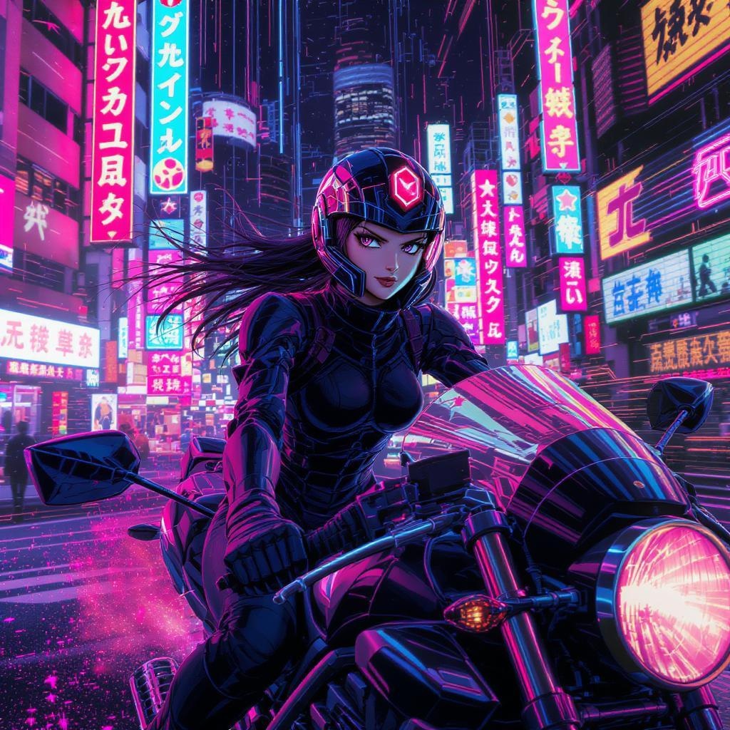A futuristic cityscape of Neo-Tokyo hums with vibrant neon lights as a confident woman, adorned in a sleek, aerodynamic helmet and riding a powerful motorcycle, weaves through the bustling streets. Her style is distinctly 80's anime with bold colors and sharp, dynamic lines, embodying the essence of retro-futurism. The air buzzes with energy and the digital billboards cast a kaleidoscope of hues on her determined face, all merging into a scene that radiates both nostalgia and the pulse of a futuristic era influenced by the iconic Akira anime aesthetic.