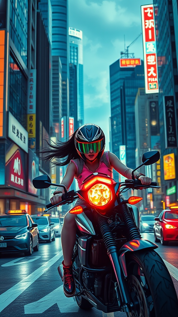 A futuristic cityscape of NeoTokyo bustles with neon lights and towering skyscrapers, where a woman in a sleek, aerodynamic helmet weaves through the traffic on her motorcycle, the sound of the engine echoing against the digital billboards. Her riding gear glows with the vibrant hues of retrofuturistic 80s anime style, reflecting the energetic spirit of the metropolis. The streets are alive with the hum of technology, an Akira-inspired urban jungle, as she navigates through it with ease and determination, her hair flowing behind like a trail of electricity.