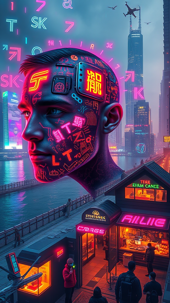 A futuristic cityscape unfolds, centered around a man whose features are intricately adorned with glowing cybernetic tattoos that pulse with vibrant neon colors. Surrounding him, a cascade of SPK-style cyberpunk characters and letters float in a dynamic holographic display. In the background, a sleek, reflective body of water mirrors the towering skyscrapers and bustling streets, all lit by the phosphorescent glow of a thousand digital billboards. A high-tech house with angular, glass architecture stands near a bustling market filled with diverse stalls vending exotic, futuristic goods, their vendors engaging in lively exchanges beneath hovering drones and dazzling light displays.
