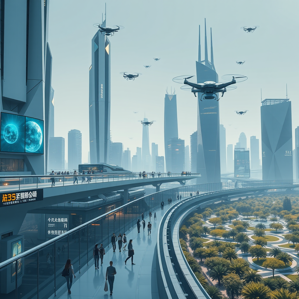 A futuristic cityscape with towering skyscrapers of sleek geometric design, interconnected by elevated walkways and hover vehicles seamlessly gliding through the air. The skyline is dotted with digital billboards and neon lights casting a soft glow, while drones zip by in efficient patterns. The scene uses a limited color palette of blues, whites, and silvers, creating a clean and modern ambiance. Inhabitants in minimalist attire move leisurely on transparent sidewalks, and distant city parks feature symmetric foliage patterns, blending nature with technology.