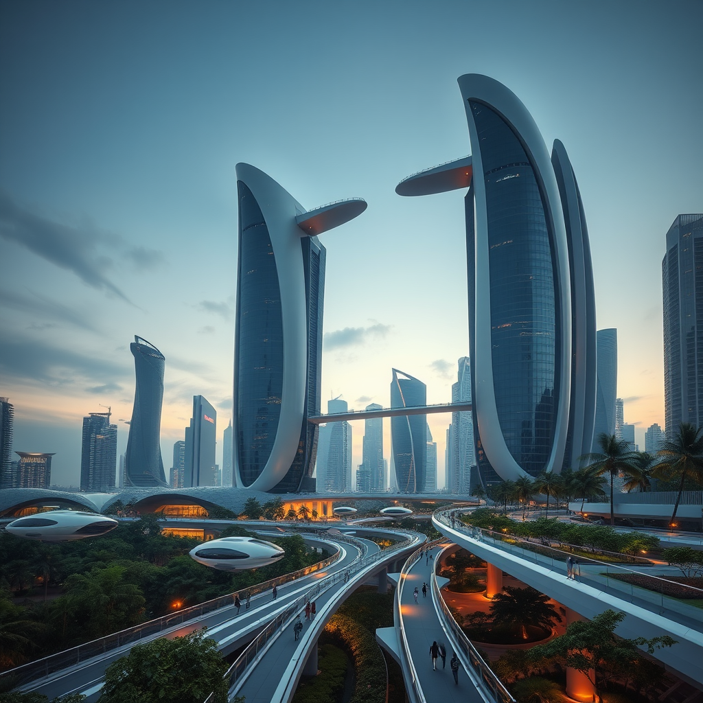 A futuristic cityscape with towering skyscrapers that feature sweeping, smooth curves and glowing elements, connected by elegant sky bridges. The city is set under a twilight sky with a limited palette of cool blues, silvers, and hints of warm golds. Hovering vehicles glide seamlessly along invisible paths, while pedestrians traverse sleek, minimalistic walkways flanked by lush greenery. The scene captures a harmonious blend of nature and technology, emphasizing harmony and efficiency.