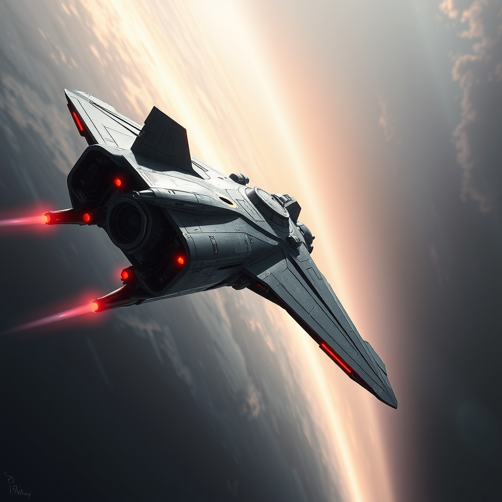 A futuristic combat spacecraft with a sleek, aerodynamic design glides against a luminous backdrop, showcasing its intricate detailing in a science fiction masterpiece style. The ship's ominous presence is captured through a matte painting reminiscent of a movie poster, embodying the golden ratio. The artwork, trending on platforms like cgsociety and artstation, echoes the styles of masters like Artgerm, H.R. Giger, and Beksinski. It is an intricately detailed, vibrant piece capturing the essence of an epic production cinematic character render with an ultra-high-quality model, exuding both a sense of awe and foreboding.
