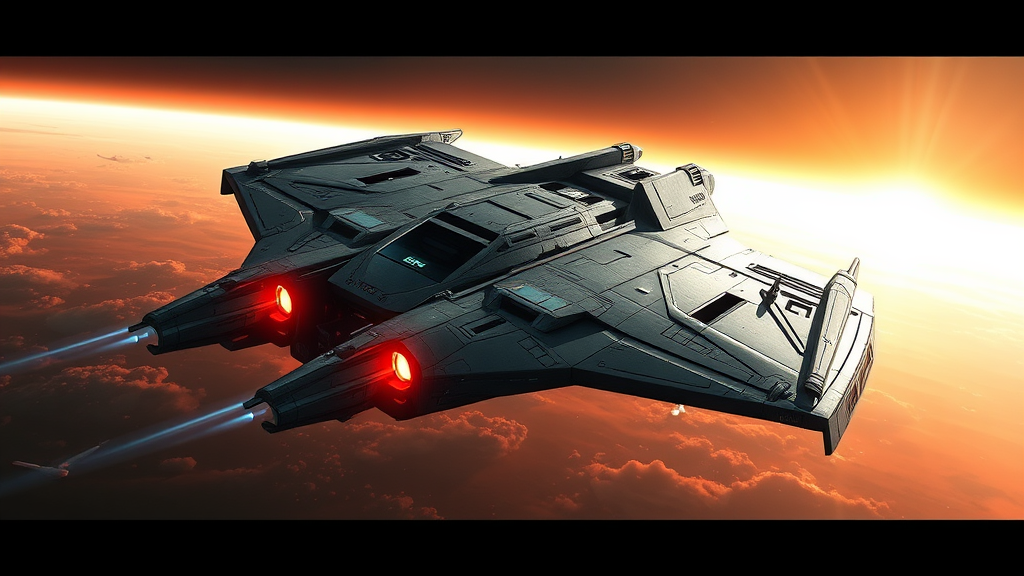 A futuristic combat spacecraft with a sleek, streamlined design set against a luminous background, showcasing intricate science fiction artistry, an ominous and epic matte painting reminiscent of movie posters, composed with the golden ratio. This masterpiece is trending on CGSociety and ArtStation, blending the visionary styles of Artgerm, H.R. Giger, and Beksinski. It boasts highly detailed, vibrant production with cinematic render quality, an ultra-high-quality model featuring complex, captivating designs that evoke a sense of awe and sophistication.