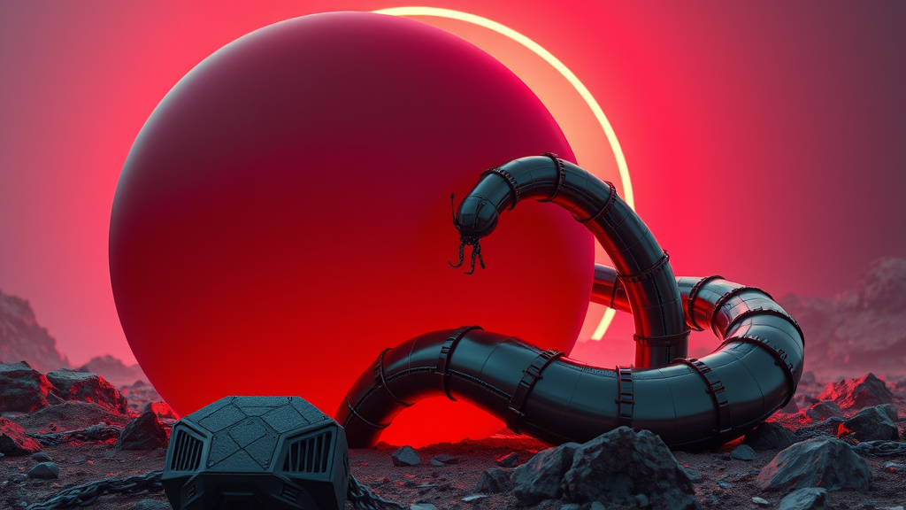 A futuristic conceptual portrait featuring a large rubber sphere, intertwined with a sleek mechanical worm, set against a radiant crimson glow. This scene is reminiscent of cutting-edge technology, with a nod to the style of Elina Karimova. Oversized technology-based objects cast in a subtle metallic black finish define the landscape, while innovative robotic forms add an avant-garde touch, evoking a raw, modern artistic vision.