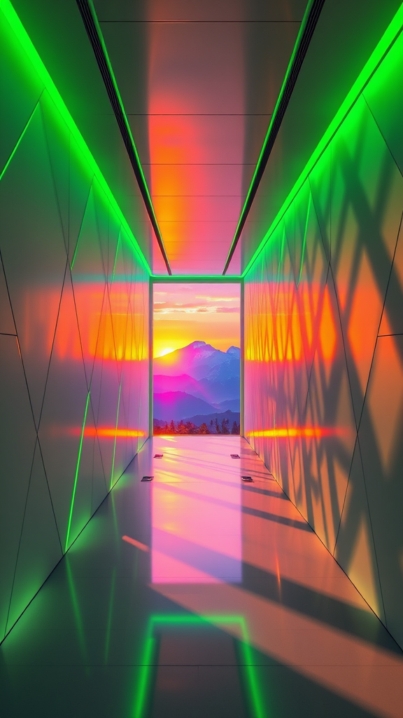 A futuristic corridor with neon green lighting casts vivid patterns on geometric white walls. The far end reveals a framed view of majestic blue mountains silhouetted against a sunset, offering a striking contrast between warm and cool hues. Dramatic shadows dance across the corridor, enhancing the sci-fi ambiance. The architectural design captures a dynamic perspective, showcasing the interplay of light and shadow while the serene mountain vista adds a touch of tranquility to the scene.
