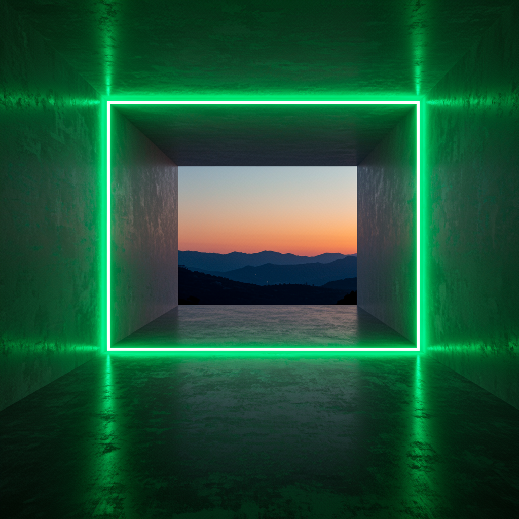 A futuristic corridor with neon green lighting, featuring geometric white walls that lead to a framed view of a mountain vista. The silhouette of the sunset casts contrasting light and shadows across the scene, enhancing the architectural photography with a sci-fi ambiance. A dramatic perspective showcases cool blue mountains in the distance, highlighting the interplay of light and geometry in a 9:16 aspect ratio, captured with a raw, unfiltered style.