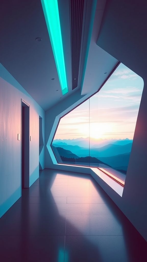 A futuristic corridor with neon turquoise illumination, angular white walls, and a panoramic window showcasing a mountain vista at dusk. The silhouette of the setting sun casts painted shadows and highlights across the stark geometry of the space, evoking a striking contrast between light and shadow. Set against a sci-fi ambiance, the architectural photography captures a dramatic perspective with serene, cool blue mountains in the distance.