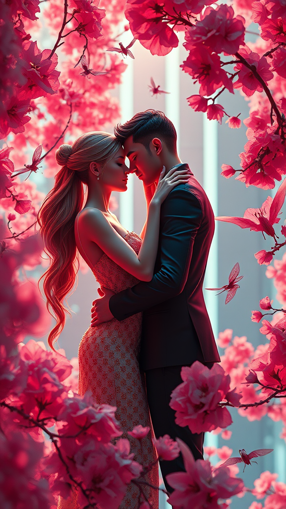 A futuristic couple embraces passionately amidst a cascade of pink blossoms, their silhouettes bathed in gold and azure hues, set against a stunning cyberpunk backdrop. Intricate details in a style reminiscent of Zbrush highlight their features, adding a fantastical and otherworldly allure. Ethereal creatures flit around them, their forms both alien and mesmerizing, weaving between the couple like guardians of a breathtaking moment. The scene captures the essence of portrait miniatures, each detail meticulously crafted, provoking awe at its beauty. A palette of dark cyan and vibrant red accentuates the surreal environment, creating a mesmerizing contrast that draws the eye into this vivid future.
