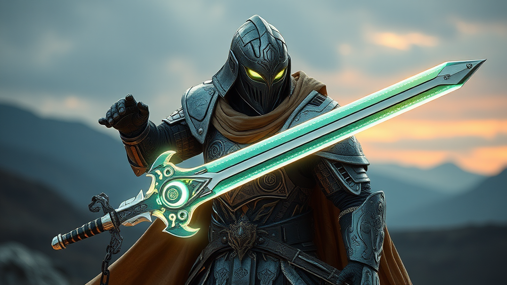 A futuristic cybernetic knight adorned in intricate robes that blend medieval and sci-fi elements, his attire shimmering with a luminescent aura. He wields a brilliantly glowing weapon, a fusion of ancient sword design and advanced technology. His armor is a sleek, metallic exoskeleton, intricately engraved with mystical symbols that pulse with energy. The scene is set against a dramatic landscape, capturing a cinematic, photorealistic quality that emphasizes the character's powerful and enigmatic presence.