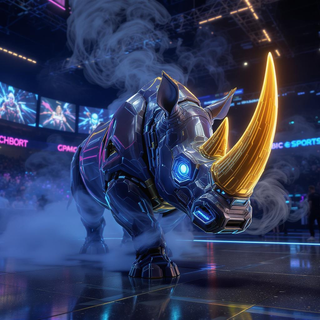 A futuristic cybernetic rhino with luminescent eyes and a bright golden horn, exuding a dynamic, competitive energy, with mist swirling around its nostrils, set in an ultramodern, visually striking esport atmosphere.
