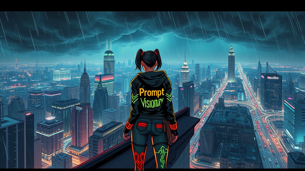 A futuristic cyberpunk heroine with glowing neon tattoos, the words "Prompt Visionary" emblazoned on her jacket, poised on the edge of a rooftop overlooking a sprawling, neon-lit dystopian cityscape. Her stance is dynamic and powerful, exuding defiance amidst the chaos. The scene is rendered in a vibrant comics style, with an extraordinary level of detail, from the intricate circuitry patterns in her attire to the bustling activity below. The lighting is both ominous and dramatic, casting stark contrasts across the skyline, as a brewing storm looms overhead. Captured with a Hasselblad-like clarity, the image employs long exposure to blur the occasional streaks of rain and the movement of distant traffic, heightening the atmospheric intensity of this dark, electrifying night.