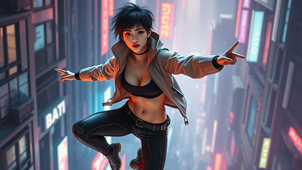 A futuristic, cyberpunk-inspired image of a slim, young Asian female supermodel with a flat chest and defined abs, characterized by her short, messy black hair. She is dressed in a high-tech Nano-weapon concealment jacket and midriff-baring apparel, paired with cutting-edge Biometric lockdown leggings. Captured in the midst of a gravity-defying, superhuman parkour move, she traverses the gritty landscape of a neon-lit, dystopian cityscape. Behind her looms the ominous presence of a Nanotech contamination quarantine zone. The scene is enveloped in vibrant, digital hues and intricate details, encapsulating the edgy, high-contrast essence of cyberpunk genre video games while introducing a creative twist.