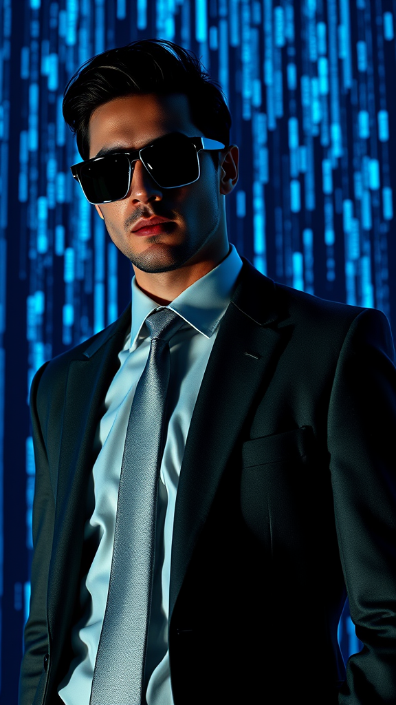 A futuristic, cyberpunk scene unfolds with a glowing matrix grid backdrop in an electric blue hue. Streams of digital code cascade seamlessly in all directions, enhancing the high-tech atmosphere. At the image's center stands a poised and confident individual clad in a sharply tailored charcoal suit paired with a crisp white shirt and a sleek, narrow silver tie. Their face is partially obscured by stylish, mirrored sunglasses reflecting subtle blue lines of code, adding a layer of intrigue. Dramatic lighting casts soft neon blue highlights around their silhouette, blending shadows into the matrix background. The scene exudes a sense of mystery and sophistication, embodying a sleek and powerful presence.