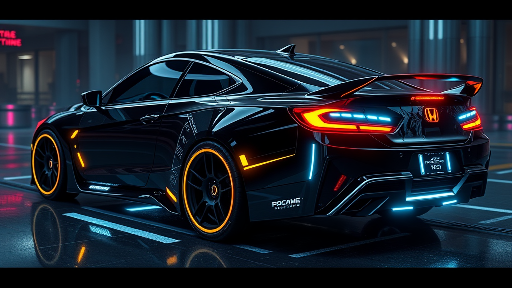 A futuristic cyberpunk sedan inspired by the 2005 Honda Integra DC5, featuring robotic elements and a sleek, minimalistic design. The concept art showcases a highly detailed, aerodynamic body with glowing neon accents and advanced tech interfaces. This 3D render combines the precision of Octane and Unreal Engine, capturing the essence of a futuristic urban environment, with an emphasis on smooth curves and sharp edges, creating a harmonious blend of innovation and performance. The vehicle's exterior is characterized by its reflective surfaces and intricate light patterns, enhancing its dynamic presence while maintaining its iconic silhouette.