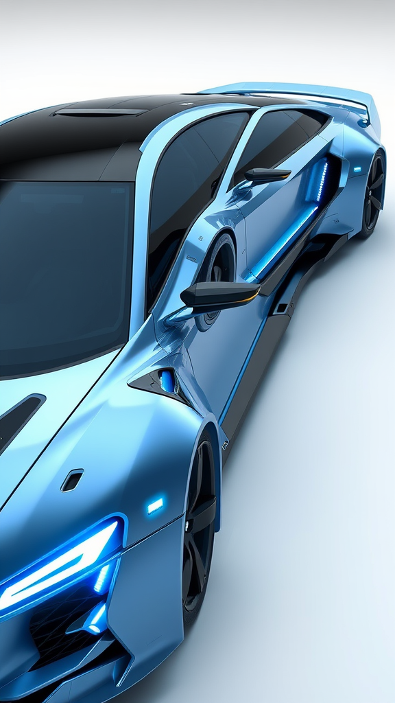 A futuristic cyberpunk sedan inspired by the 2005 Honda Integra DC5, featuring a robotic and sleek design with minimalistic curves, showcasing cutting-edge concept art influences. The vehicle has a streamlined body with advanced aerodynamic features, high-detail textures, and neon light accents along the contours. Rendered in ultra-realistic 3D using art station, octane, and Unreal Engine techniques, the design incorporates seamless integration of advanced technology elements and transparent OLED panels on the side windows, enhancing its futuristic appeal. The sedan features a dynamic color palette of metallic blues and chrome silver, highlighting its cyberpunk aesthetic.