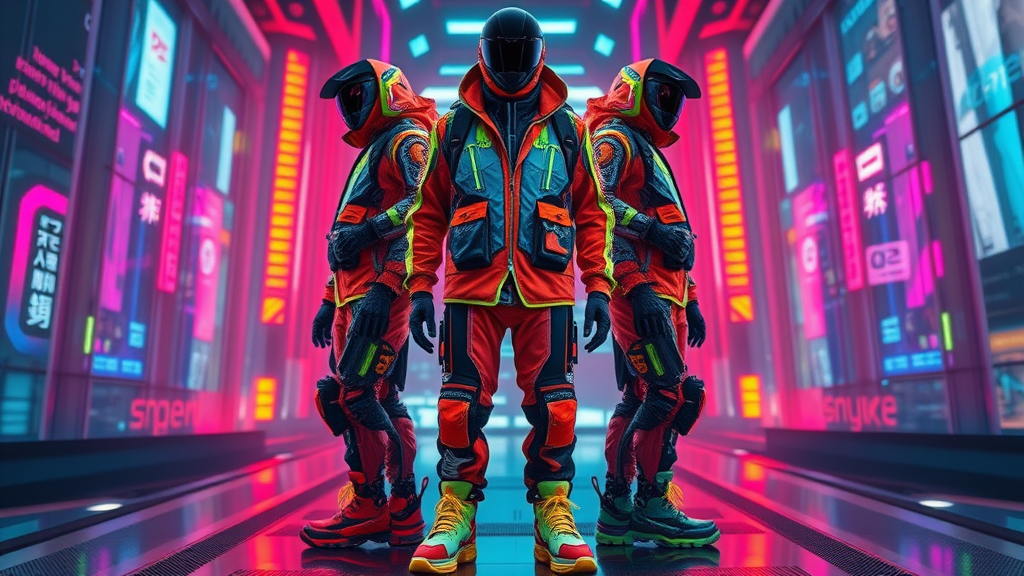 A futuristic cyberpunk techwear streetwear ensemble, seen from feet to head, featuring highly detailed and intricate designs. The look follows the golden ratio, bursting with vibrant colors, embodying a hypermaximalist and luxurious aesthetic. Set against a cinematic, elite backdrop, the outfit seamlessly merges techwear fashion with cutting-edge influences. Drawing inspiration from the minds of Errolson Hugh, Nike ACG, Yohji Yamamoto, Y3, and ACRNYM, this attire showcases a fusion of advanced materials and sleek lines. The setting reflects a high-tech matte painting, where avant-garde meets opulence in a bold, visionary style.