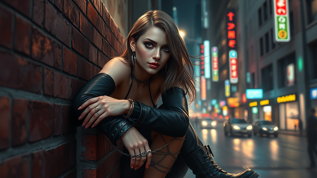 A futuristic cyberpunk woman leaning on a brick wall in a neon-lit city street at night, surrounded by city lights and urban buzz. Her face is detailed, symmetrical, with reflective eyes and dramatic makeup. She has long hair flowing and short hair at the sides, adorned with ear piercings and many rings. Her outfit features long sleeves and multiple bracelets, and she's wearing muddy boots, evoking a punk, alt-girl vibe. The lighting is intricate and dramatic, using rim lighting and chiaroscuro techniques, creating a professional majestic impressionism style reminiscent of Waterhouse, John Constable, Jeremy Mann, and Studio Ghibli. The artwork, full of intricate details, conveys a high level of craftsmanship, inspired by trending artists on ArtStation and CGSociety, reflecting a blend of impressionism and cyberpunk aesthetics with a majestic air, inspired by the styles of Makoto Shinkai and Antonio Moro.