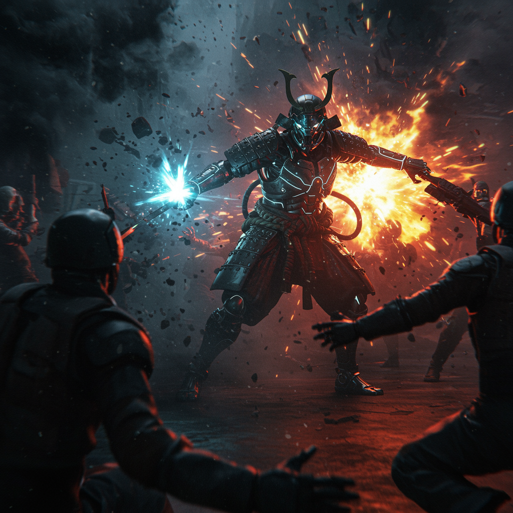 A futuristic cyborg samurai-like entity unleashes a fierce attack against adversaries amidst swirling jet-black smoke and vivid explosions of color. The scene is incredibly detailed, with a dark, atmospheric ambiance. The cyborg's armor gleams with a high-detail texture, featuring intricately designed metal plates and neon highlights. As the action unfolds, the environment is illuminated by the ray-traced lighting, casting dramatic shadows and creating a highly realistic, yet slightly exaggerated cartoonish effect. The combination of FW Murano-inspired chaos and dynamic movement immerses the viewer in a world of intensity and vibrant energy.