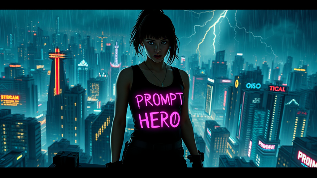 A futuristic digital artwork featuring a cyberpunk girl standing boldly on a rooftop, her silhouette defined against the sprawling maze of a dystopian city aglow with neon signs and holograms. The words "Prompt Hero" are emblazoned across her chest in luminescent, pulsating text. She's captured in a dynamic, confrontational stance, her eyes fierce and determined, embodying the spirit of rebellion. The image is composed in an intricate, comic book style with hyper-detailed elements. The scene is illuminated by a blend of ominous and dramatic lighting, with flashes of lightning cutting through the stormy, rain-soaked night sky. Photographed in a long exposure style using the rich, cinematic quality of a Hasselblad camera, the artwork conveys a sense of intense energy and post-apocalyptic ambiance, drawing the viewer into its electrifying world.
