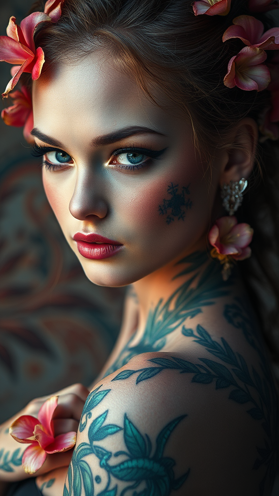 A futuristic fantasy-inspired tattoo artist adorned with blue tattoos and delicate flowers on her skin, captured in an oil portraiture style with an intense gaze. The artwork is infused with light red and teal hues, reminiscent of rococo portraitures, combined with a dark and explosive atmosphere. The tattooed girl poses confidently in a photo shoot, depicted in the style of digital manipulation. Influences of Tanya Shatseva and Daniel F. Gerhartz are evident in the intricate imagery, utilizing a palette of dark pink and light blue. The high-resolution, ultra-high-definition image is rich with details, offering a unique blend of oil portrait techniques and contemporary digital artistry.