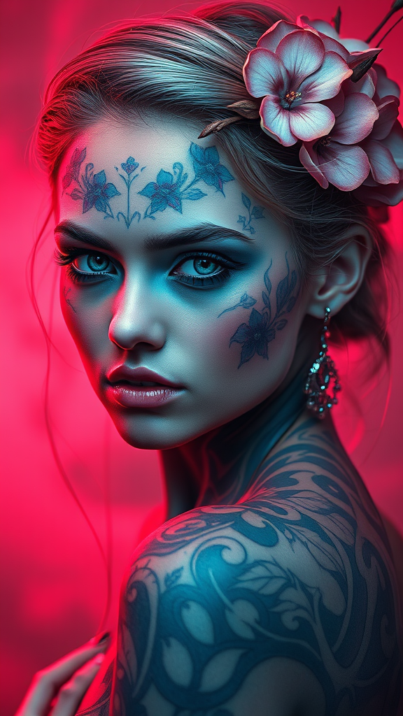 A futuristic fantasy oil portrait featuring a tattoo artist adorned with intricate blue tattoos and delicate flowers across her skin. Her intense gaze captivates, set against a backdrop infused with light red and teal hues. The composition echoes rococo elegance with a digital manipulation twist, reminiscent of the styles of Tanya Shatseva and Daniel F. Gerhartz, blending dark pink and light blue tones. The scene is both dark and explosive, capturing the tattooed girl in a striking photo shoot pose. The image is a high-resolution masterpiece of intricate imagery, comparable to UHD quality, offering a blend of traditional and contemporary artistry with subtle imaginative adjustments.